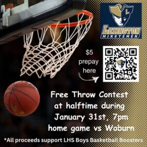 Read MoreJoin the Lexington High School basketball program this Friday night, 1/31/25 at 7pm at home for the LHS Boys Varsity 🏀 Basketball game and a free throw contest at halftime! Anyone is welcome to ✍🏻 sign up and compete for fun LHS swag and bragging rights! Sign up now via the QR code on the…